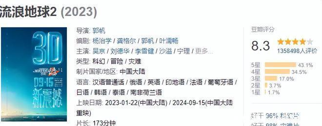 除了殊效过劲外,《流浪地球2》的故事情节方面,也尽头过劲,故事逻辑严谨,演员演技到位,东谈主物形容的也齐尽头完好,最终《流浪地球2》的评分比第一部还高,135万东谈主打出了8.3的好成绩。
