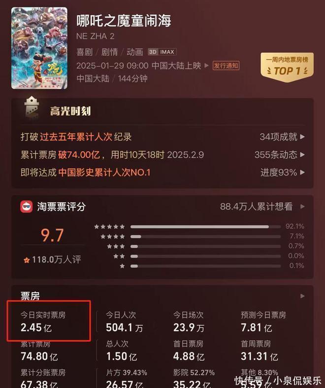 时于本日,《哪吒2》的票房成绩照旧冲到了74.8亿,今天固然照旧是大年头十了,可哪吒依旧斩获了2.4亿的单天票房成绩,真的尽头夸张。
