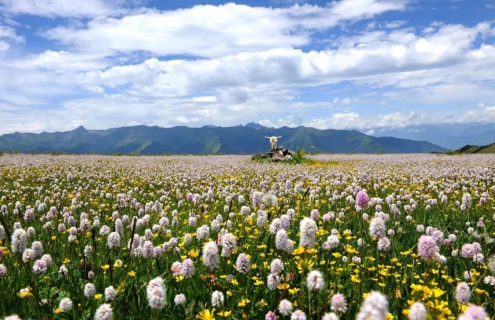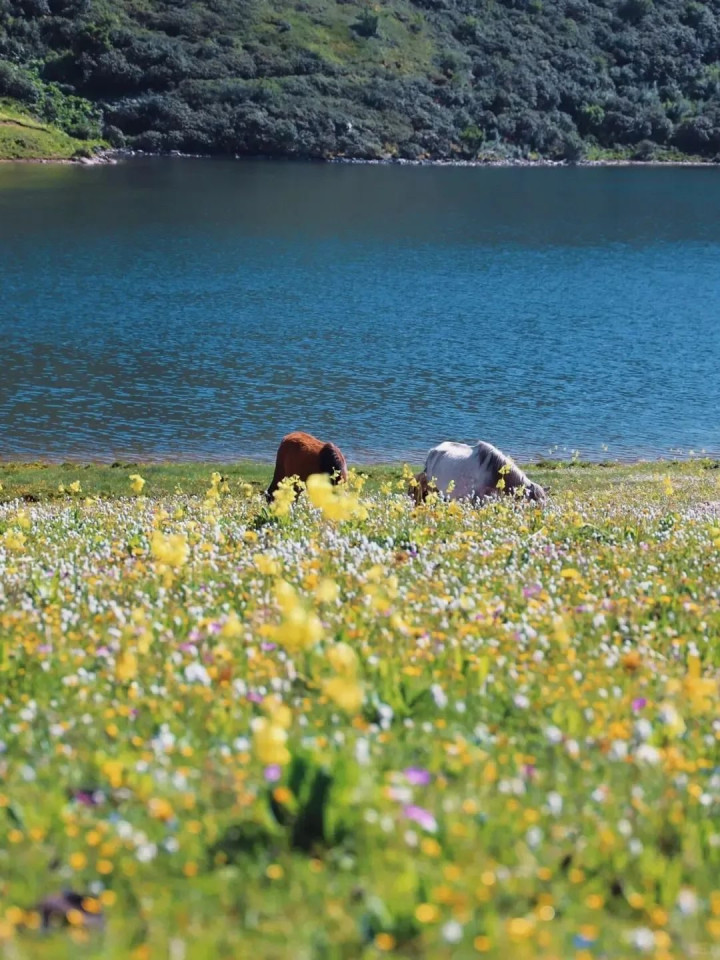 神奇的是,风雨事后,这儿的花草反而长得更精神!满山遍野叫不上名的野花,随处埋头干饭的牦牛,命运好的话,还能相见骏马奔突而过的萧洒身影!