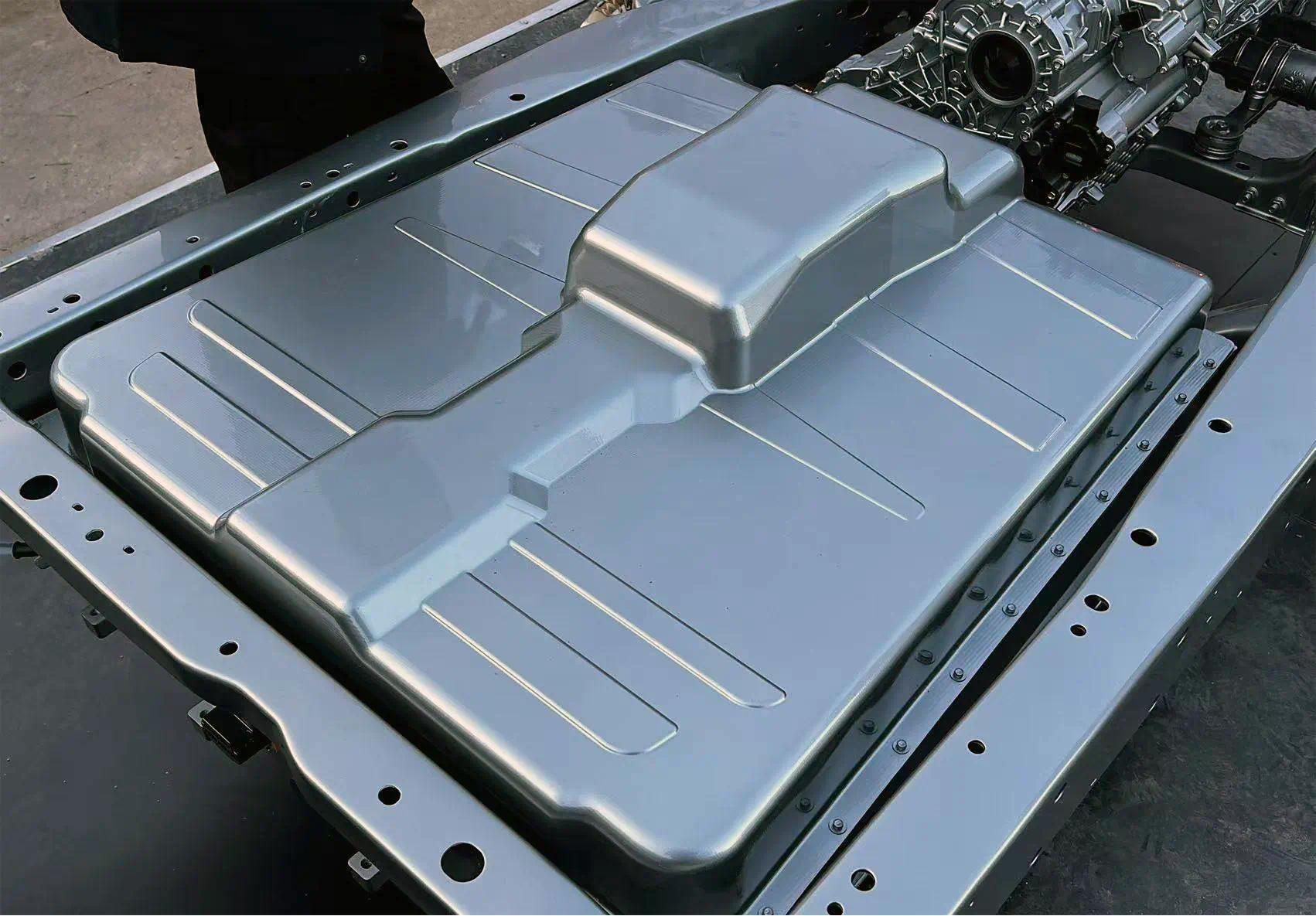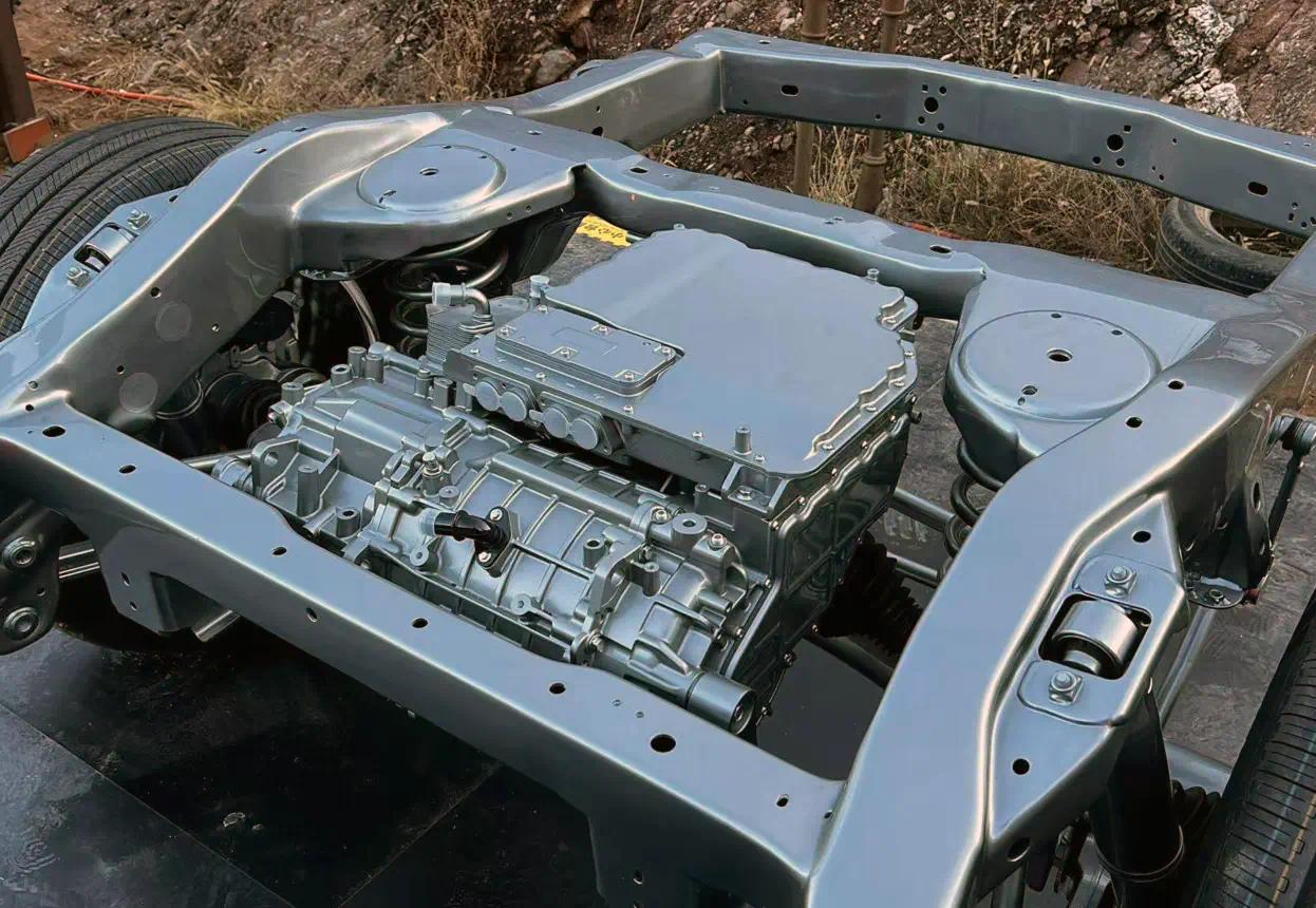 这套底盘有纵置发电机、变速器,还有一台后电机;要点是中间为能源电板组,底盘下方莫得分动箱和后传动轴!是以这套四驱平台便是由前置发电机、变速器里的电动无邪手前轮,由后电无邪手后轮的系统。