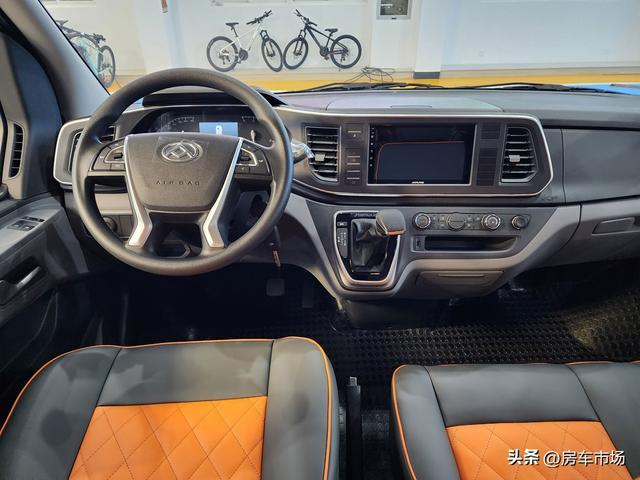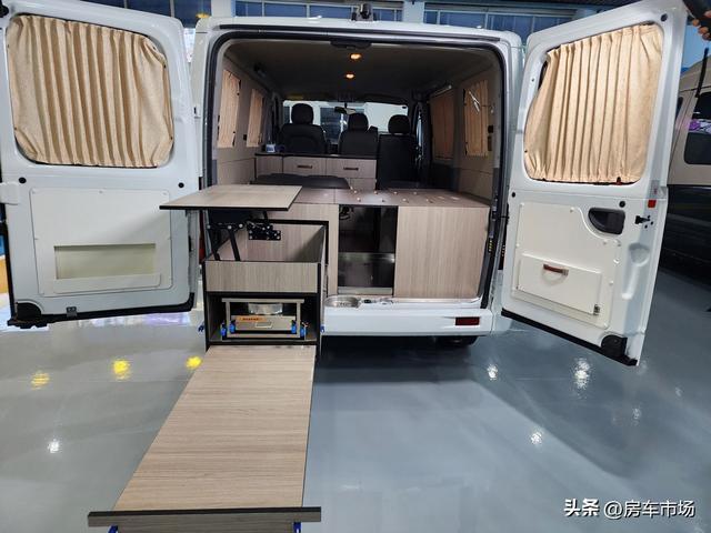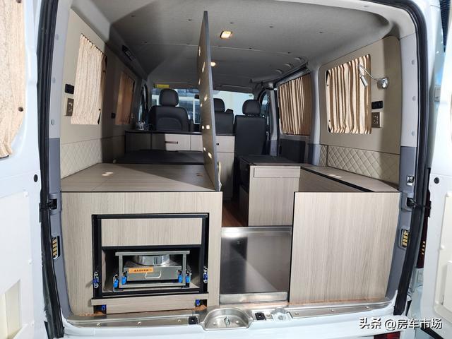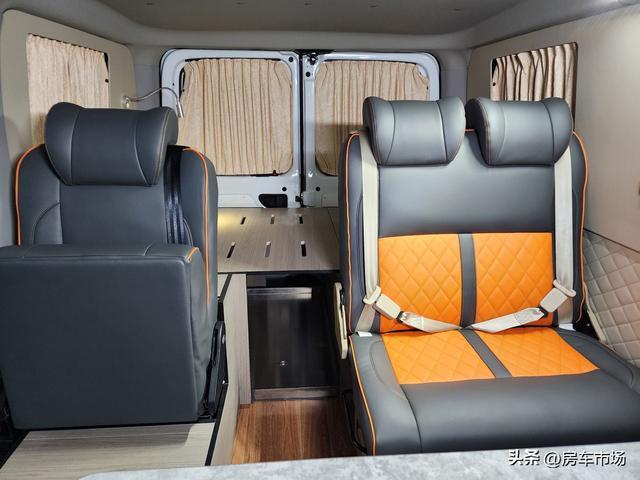 前三后三的座椅布局整车可荷载6东说念主。会客区位于驾驶舱的后部,野心有多功能组合柜以及2张宽大的沙发座椅,结识的座椅取舍真皮包覆,配有安全带座椅可前后移动和谐,靠背可翻折放倒与后部区域组合拼床,拼床后的尺寸可达2*1.8米。在不需要拼床时,后部固定床的尺寸是1.8*1.1米。前部组合柜内嵌有一台50L车载雪柜且桌面可拓展,拓展桌板可收纳于一侧。