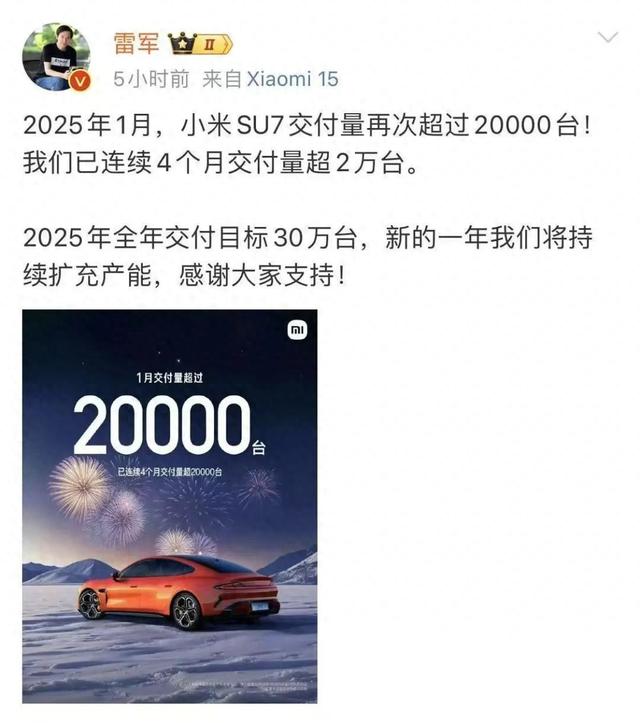 小米汽车晓示,2025年1月,小米SU7录用量再次普及20000台。当今已联结4个月录用量超2万,2025年全年录用见识30万台。