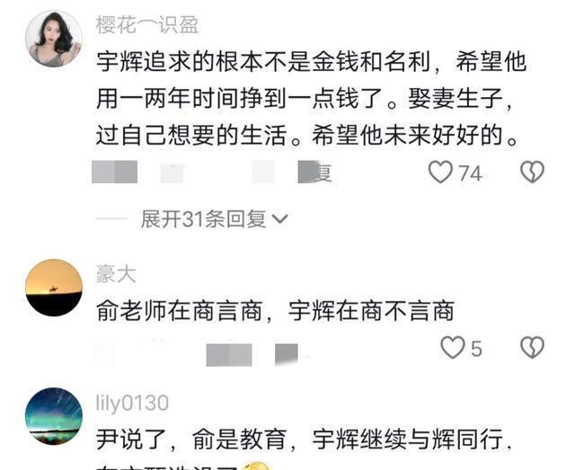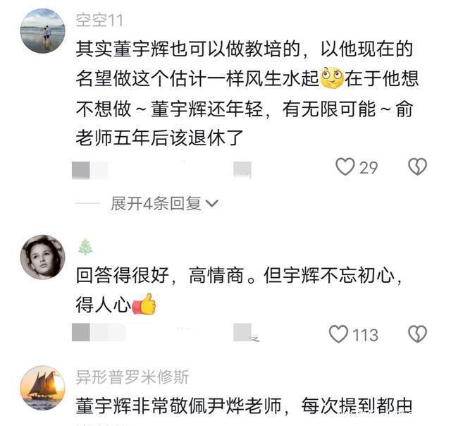董宇辉是大家相称可爱的网红,他频频在直播间可以说出金句,而况讲古今中外学问,体现出了过东谈主的才华。俞敏洪是着名企业家,因为公司转型直播助农,给了董展示才华的空间,而对方也凭借一己之力让公司东山再起,两东谈主可以说是相互确立。