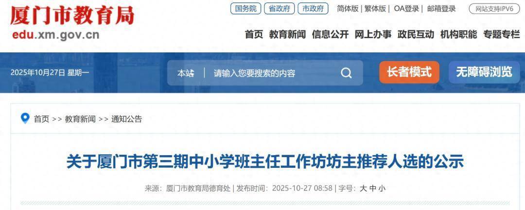 凭证《对于作念好厦门市第三期中小学班主任职责坊坊主遴荐职责的见知》,经个东谈主肯求、学校保举、经历审核、大家评审,厦门市第三期中小学班主任职责坊坊主保举东谈主选仍是产生,现予公示。