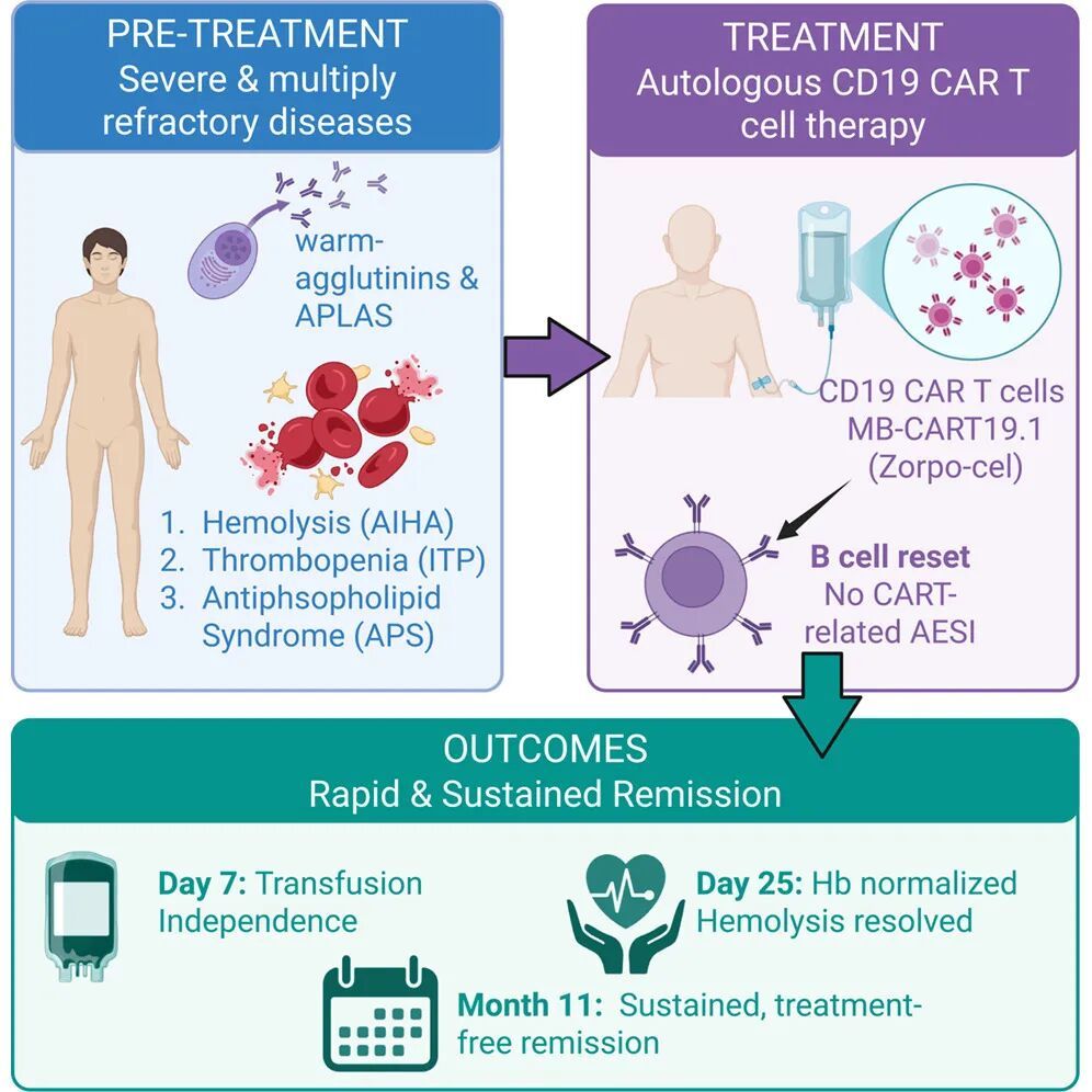 这一荒谬案例标明,CD19 CAR-T 细胞疗法大略使严重难治自己免疫性溶血性贫血(AIHA)速即且捏久地缓解,同期改善伴发的免疫性血小板减少症(ITP)和抗磷脂抗体笼统征(APLAS),且毒性响应精良无比。