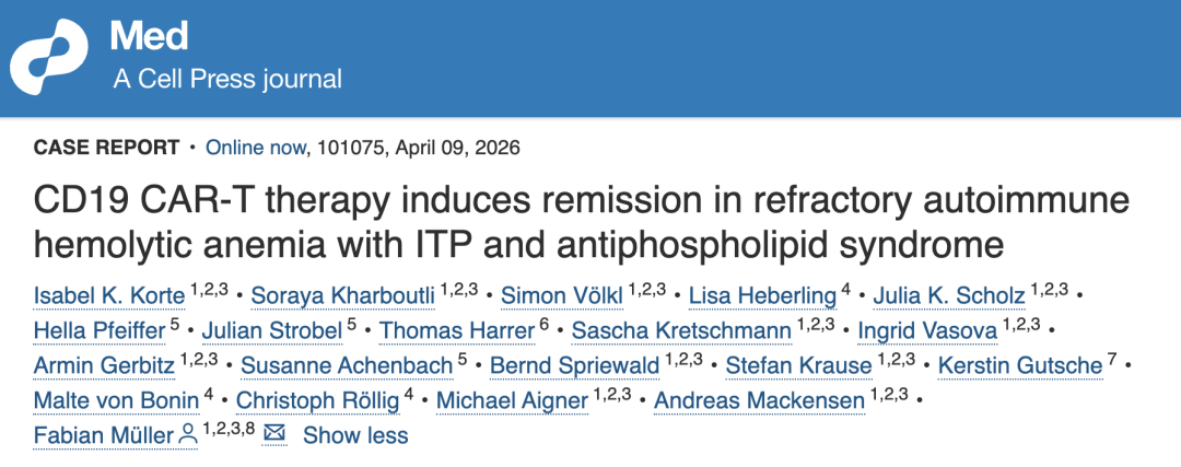 该商议于 2026 年 4 月 9 日发表在了 Cell 子刊 Med,论文题为:CD19 CAR-T therapy induces remission in refractory autoimmune hemolytic anemia with ITP and antiphospholipid syndrome。